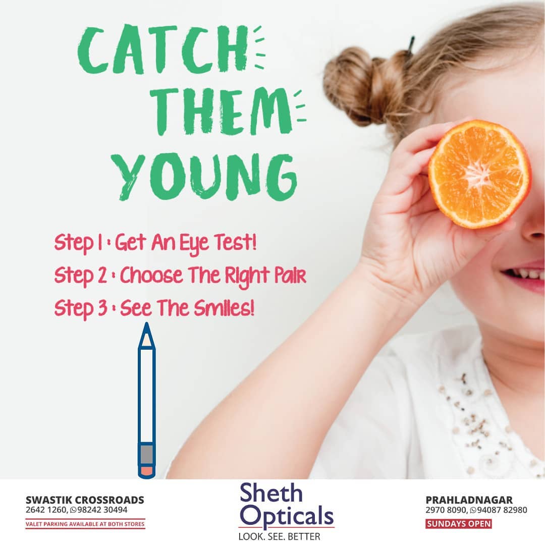Catch Them Young STEP 1 Get An Eye Test STEP 2 Choose The Right Pair STEP 3 See The Smiles This exam season don t take your kids complaint for sore eyes lightly Visit us for their FREE eye checkup with right advise from a qualified Optometrist Showrooms at 079 2970 8090 Whatsapp 94087 82980 OR 079 2642 1260 Whatsapp 98242 30494 Valet parking available at both stores Sunday open 100 UV protection sunglasses available Now buy on easy with Earn points with every purchase