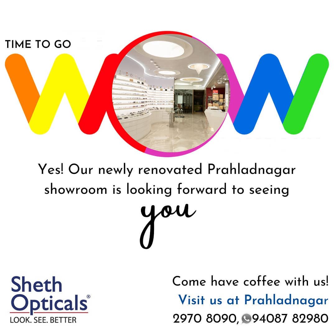Check out the new look of Sheth Opticals Prahladnagar showroom Swipe Left Do visit us or call 079 2970 8090 whatsapp 94087 82980